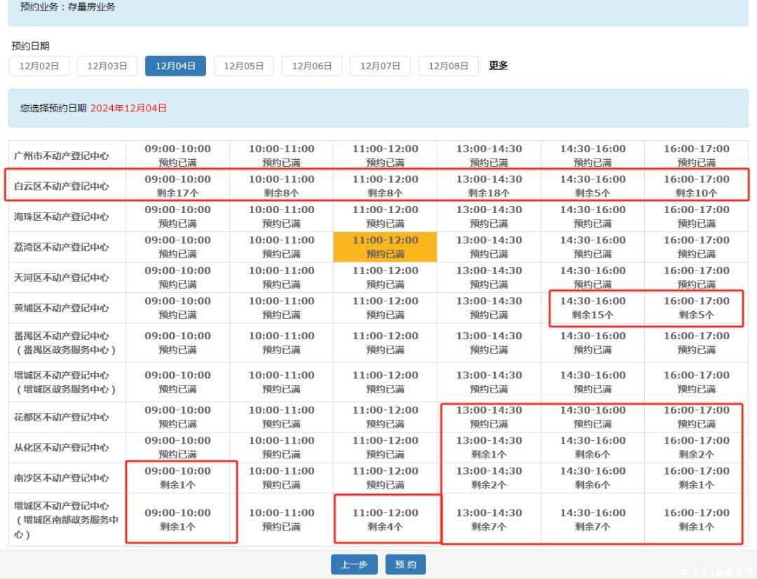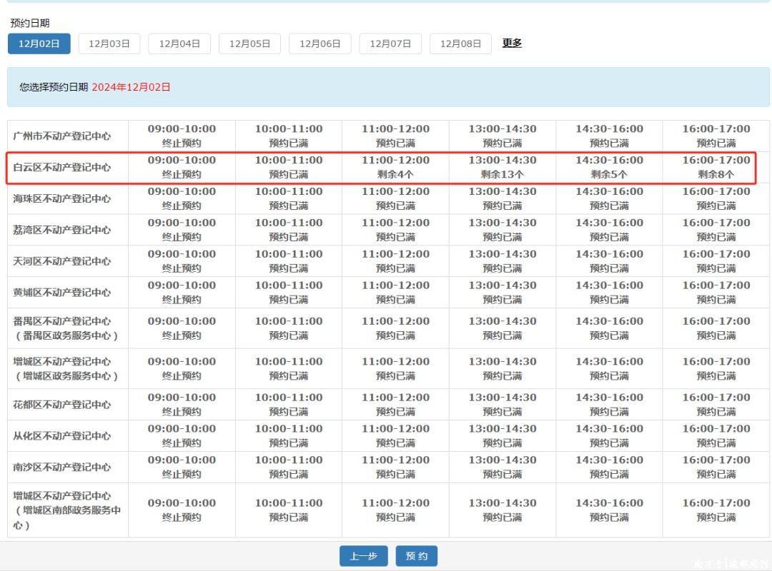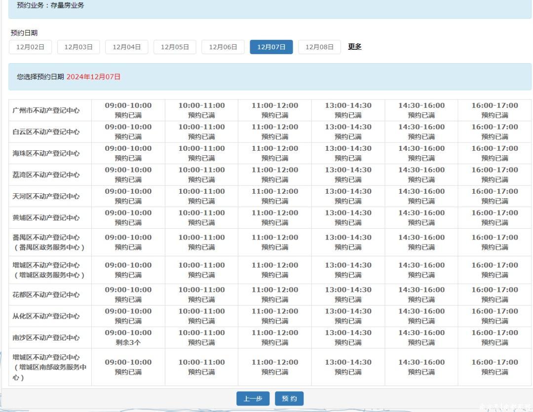 南都湾财社记者在9点30分以后登陆广州市不动产登记网上预约系统,尝试预约存量房交易登记,发现12月2日的网上预约中,除了白云区不动产登记中心尚有11点至下午5点共30个预约号外,其他11个中心均已全部约满。同样,12月3日,也只有白云不动产登记中心尚有余号可以预约,其他11个中心皆已约满。到12月4日,则只有海珠区不动产登记中心、番禺区不动产登记中心(番禺区政策服务中心)、增城区不动产登记中心(增城区政务服务中心)全部预满,别的中心部分时段仍可预约。